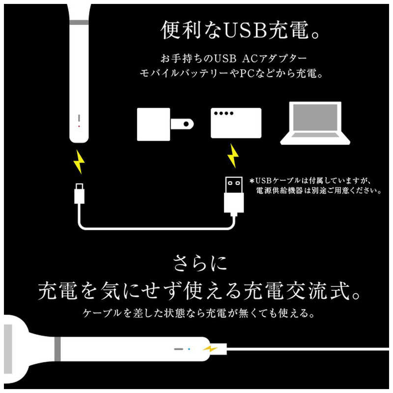 ●充電交流式:充電が無くなってもコードを差せば使えます。充電は新スタンダードの TypeC。
