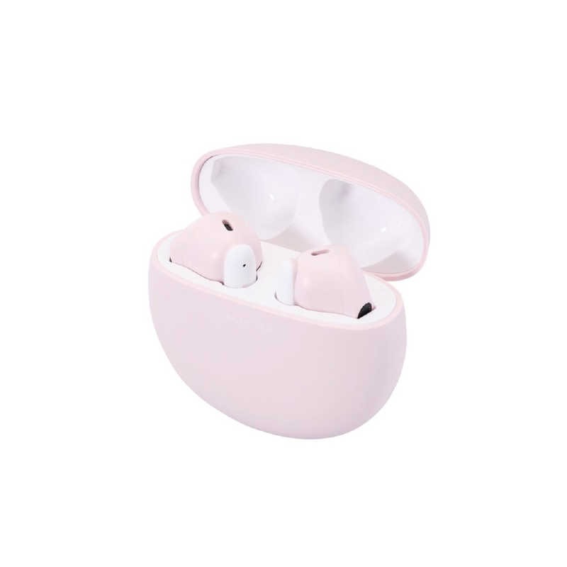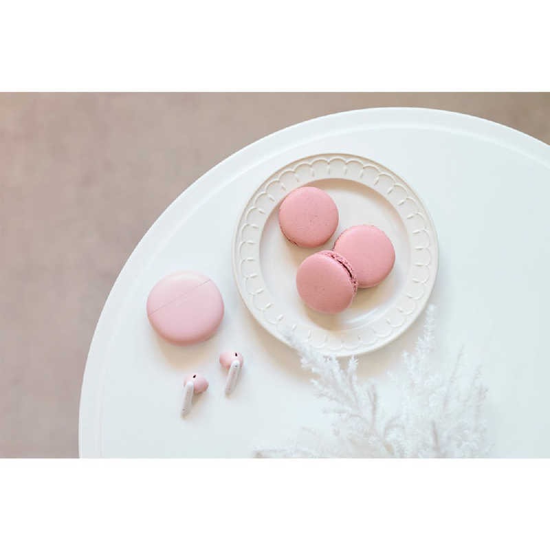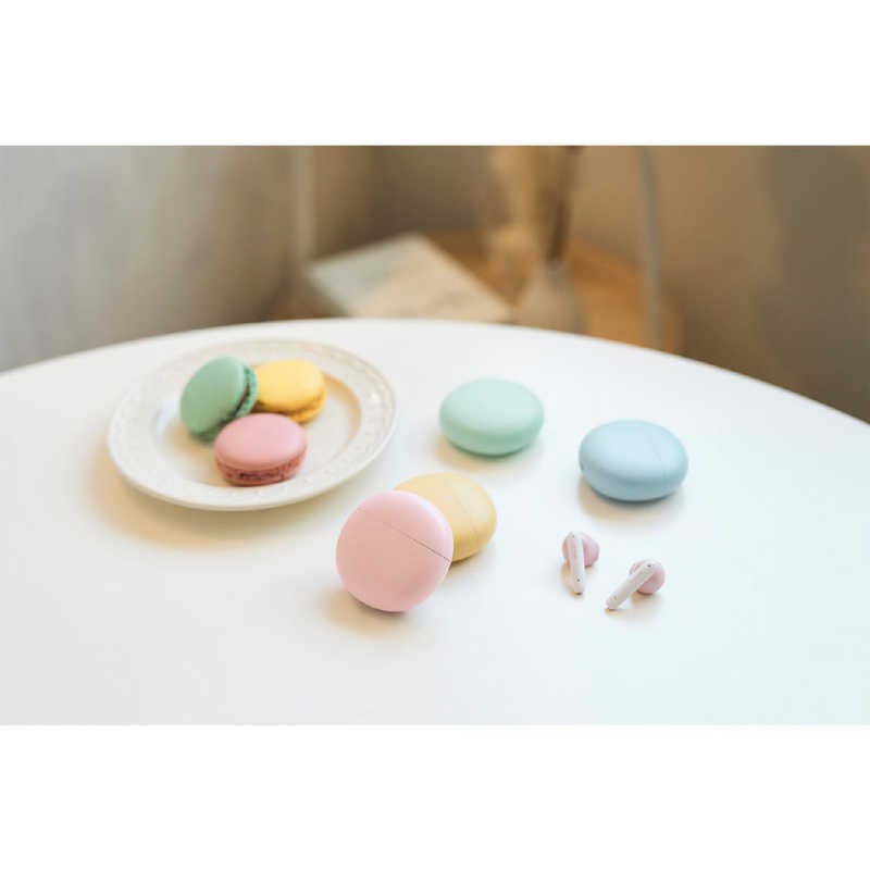 ●充電ケースはマカロンのようなまるくてコロンとした形がポイントです。ファッションのワンポイントにもなる、やわらかながら存在感のある「ピンク」「ブルー」「グリーン」「イエロー」をラインアップしています。