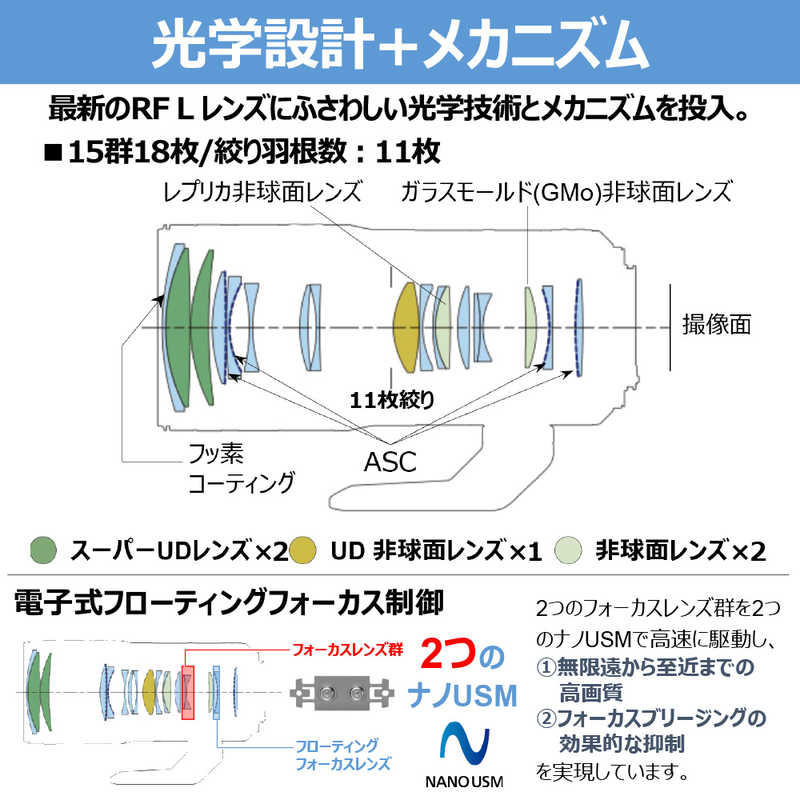 ●2つのナノUSMによる電子式フローティングフォーカス制御と、EOS Rシステムのデュアルピクセル CMOS AFとのコンビネーションで、高速・高精度な静止画AFを実現。動画撮影においても、動作中の静粛性の高さと、被写体の動きやタッチフォーカス操作へのなめらかな追従により、高品質な動画を撮影することが可能。