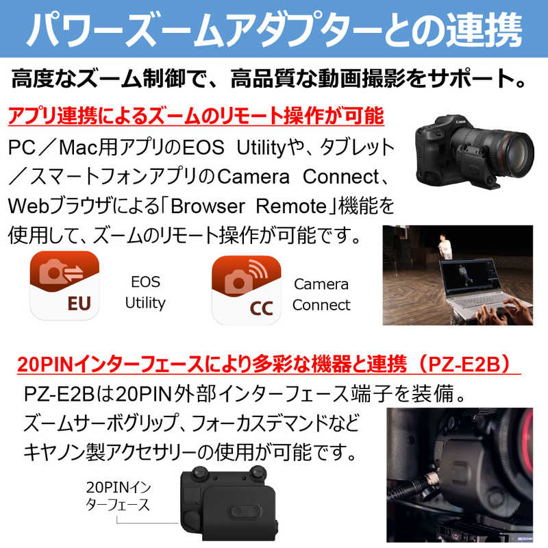 ●幅広い撮影シーンで高画質を実現する静止画撮影に加え、アイリスリング(絞りリング)の搭載やパワーズームアダプターPZ-E2/PZ-E2Bへの対応により快適な動画撮影も実現。