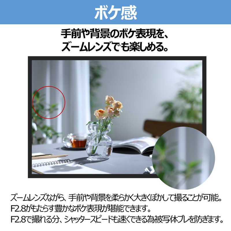 ●ズーム全域で大口径F2.8、レンズ内手ブレ補正機構も搭載しながら、小型・軽量で気軽に持ち運べる使い勝手のよい標準ズームレンズ。