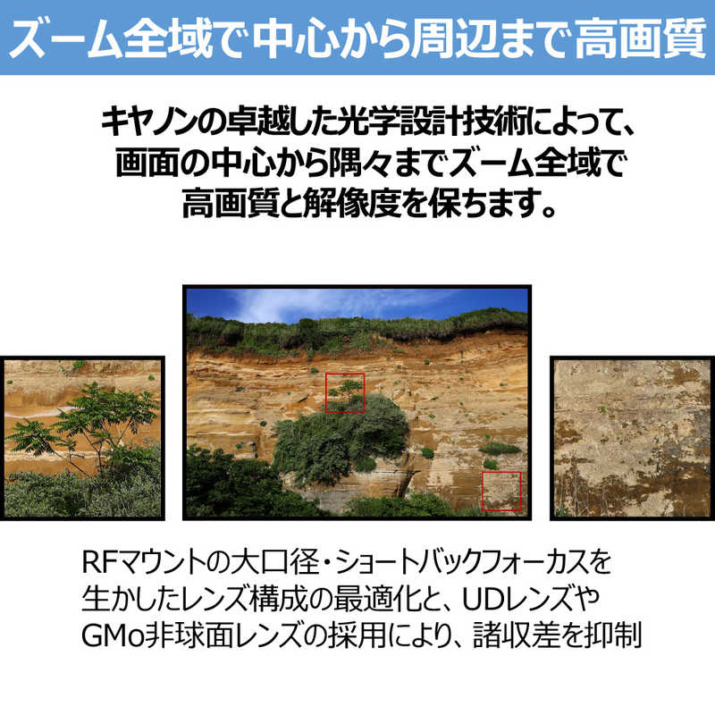 ●RFマウントの大口径・ショートバックフォーカスを生かしたレンズ構成の最適化と、UDレンズやGMo非球面レンズの採用により、収差を抑制し、RF24-105mm F4 L IS USM 同等以上の高画質を実現。