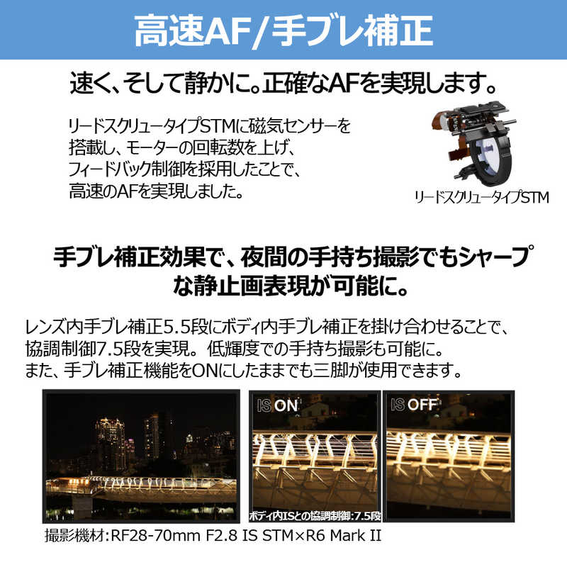 ●リードスクリュータイプのSTMを搭載し、EOS Rシステムのカメラが搭載するデュアルピクセルCMOS AFの優れたAF性能との連携により、フォーカス移動がなめらかで自然な動画AFを実現するとともに、動画撮影中のフォーカス操作によって生じる画角変動を、カメラで電子的に補正するフォーカスブリージング補正に対応。