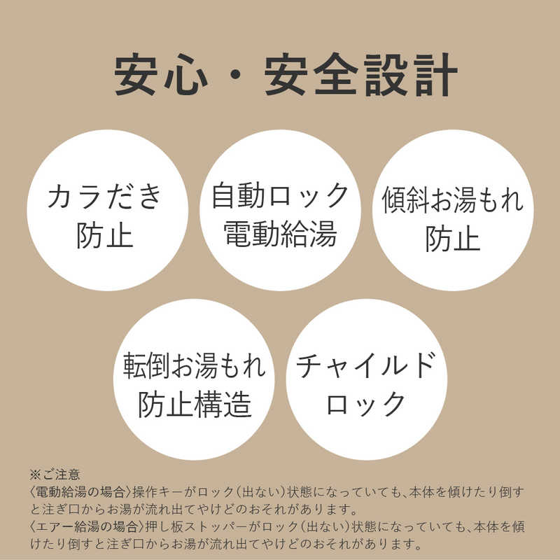 ※3 <電動給湯の場合>操作キーがロック(出ない)状態になっていても、本体を傾けたり倒すと注ぎ口などからお湯が流れ出てやけどのおそれがあります。
