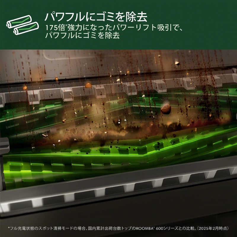 従来比175倍の吸引力でごみを除去(Roomba600シリーズと比較、フル充電スポット清掃時)