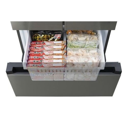 ●冷凍室上段は可動式の仕切り付き冷凍室仕様なので冷凍食品を立てて収納でき、下段にはスライドトレイがあるので製氷皿が置けます。