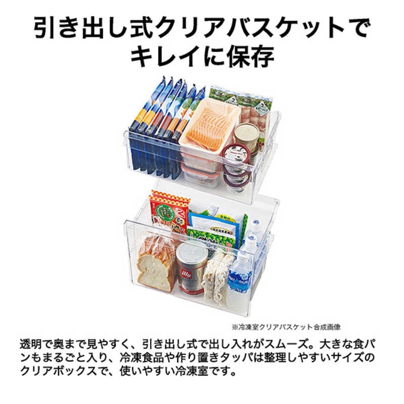 透明で奥まで見やすく、引き出し式で出し入れがスムーズ。大きな食パンもまるごと入り、冷凍食品や作り置きタッパは整理しやすいサイズのクリアボックスで、使いやすい冷凍室です。