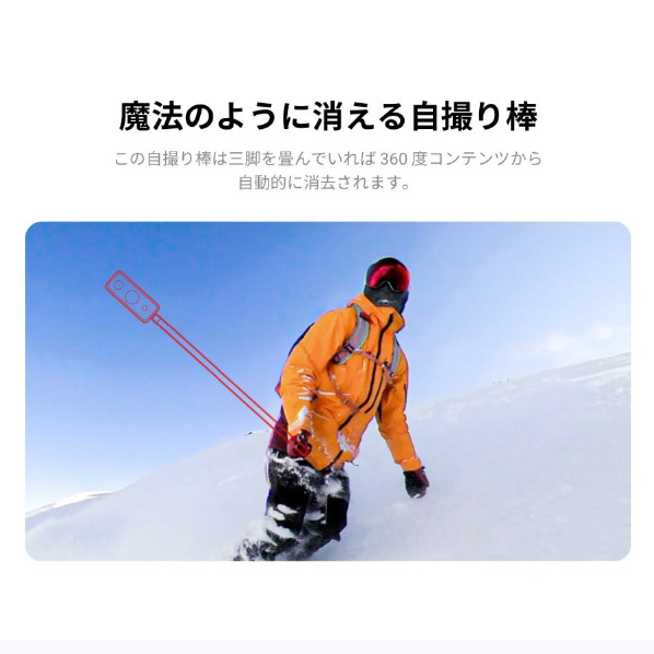 ●見えない自撮り棒:360度撮影で自動的に消えるので、ユニークなドローン風アングルで撮影できます。