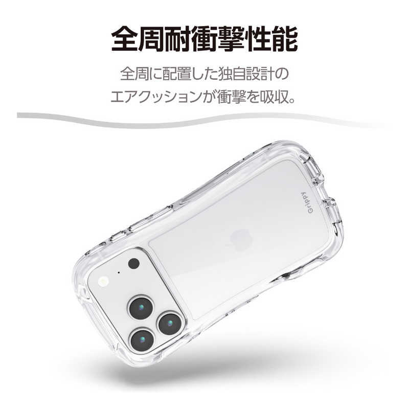 ■全周に配置した独自設計のエアークッションが衝撃を吸収し、背面には高硬度のポリカーボネート素材を採用。中央のくびれ形状に平坦な面を設けることで、手に馴染む快適なグリップ感を実現したGrippyシリーズのハイブリッドケースです。端末のデザインが美しく際立つオールクリアタイプです。