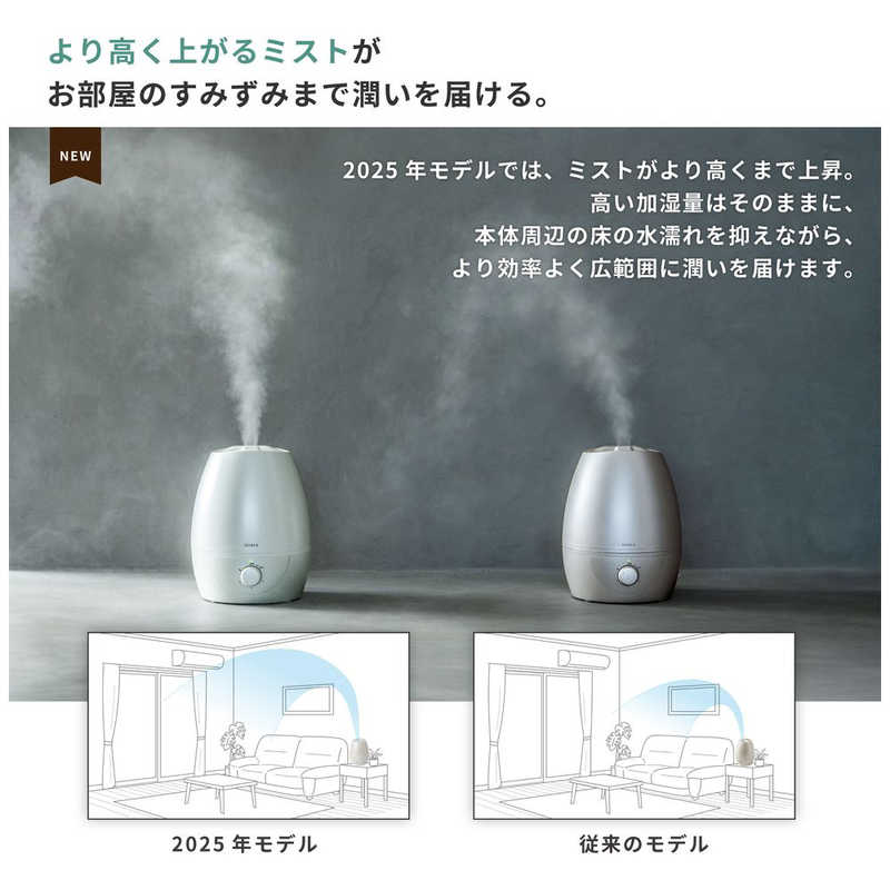 ミストを高くまで上げることで床など本体周辺の水濡れを抑え、効率よくパワフルに加湿できる一台です。