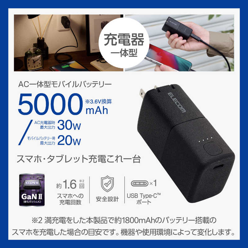 エレコム ELECOM AC充電器一体モバイルバッテリー(5000mAh/30W/C×1) DE-AC09-5000BK