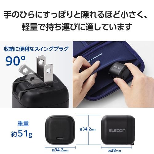 ■GaN II(窒化ガリウム)を採用し、高出力ながらコンパクトサイズを実現。プラグ部分も折り畳むことができるため、バッグの中でもスペースを取らず、ビジネスでの外出やリモートワーク、出張、旅行など持ち運びにも便利です。