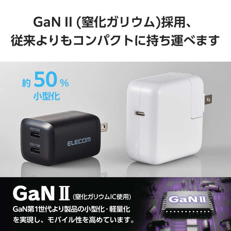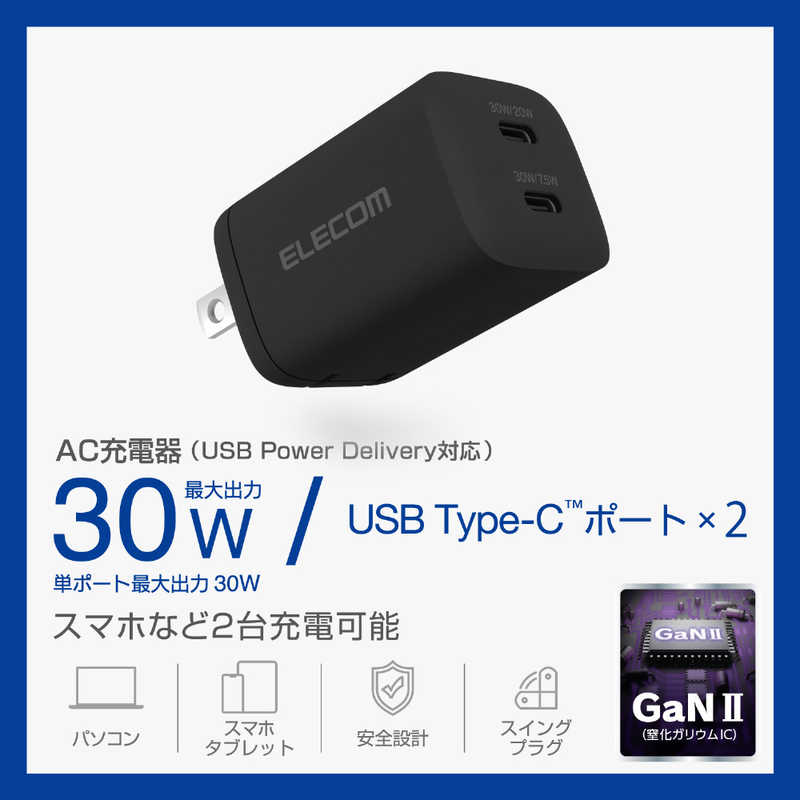 ■定格出力電力:単独接続時:USB Type-C1ポート/USB Type-C2ポート最大出力30W、PPS最大出力30W、2ポート同時接続時:合計最大出力27.5W、USB Type-C1ポート最大出力20W、USB Type-C2ポート最大出力7.5W