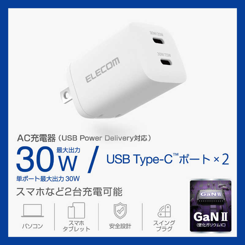 ■USB Type-C(TM)ポートを2ポート搭載し、Macbook Airなど対応するノートパソコン・スマートフォン・タブレットを充電できるAC充電器です。