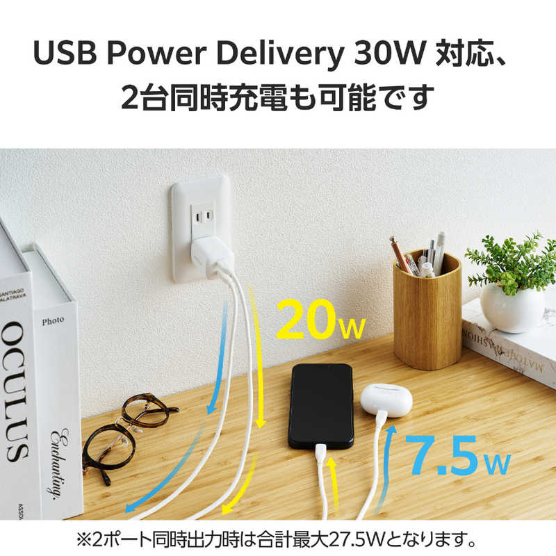■定格出力電力:単独接続時:USB Type-C1ポート/USB Type-C2ポート最大出力30W、PPS最大出力30W、2ポート同時接続時:合計最大出力27.5W、USB Type-C1ポート最大出力20W、USB Type-C2ポート最大出力7.5W