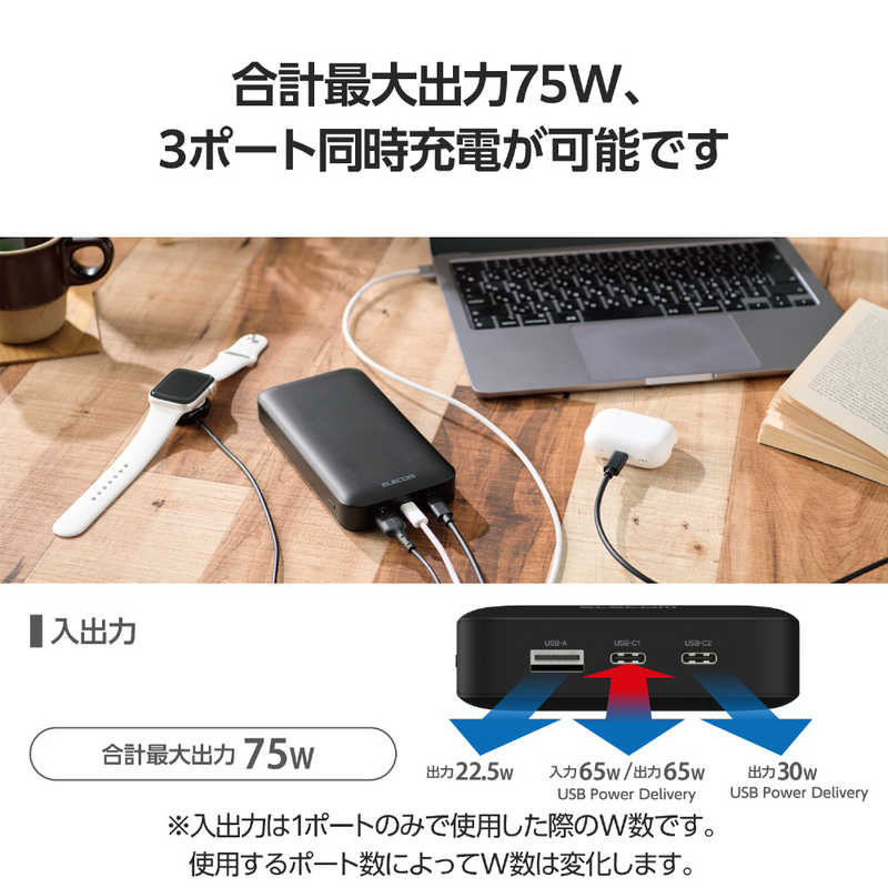■USB Type-Cポートを2ポート、USB-Aポートを1ポート搭載しており、合計最大75Wの出力が可能な高出力モデルです。