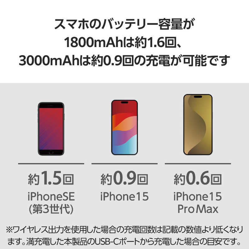 ■本製品(バッテリー容量5000mAh)で、1800mAhのスマートフォンを約1.6回、3000mAhのスマートフォンを約0.9回充電可能です。