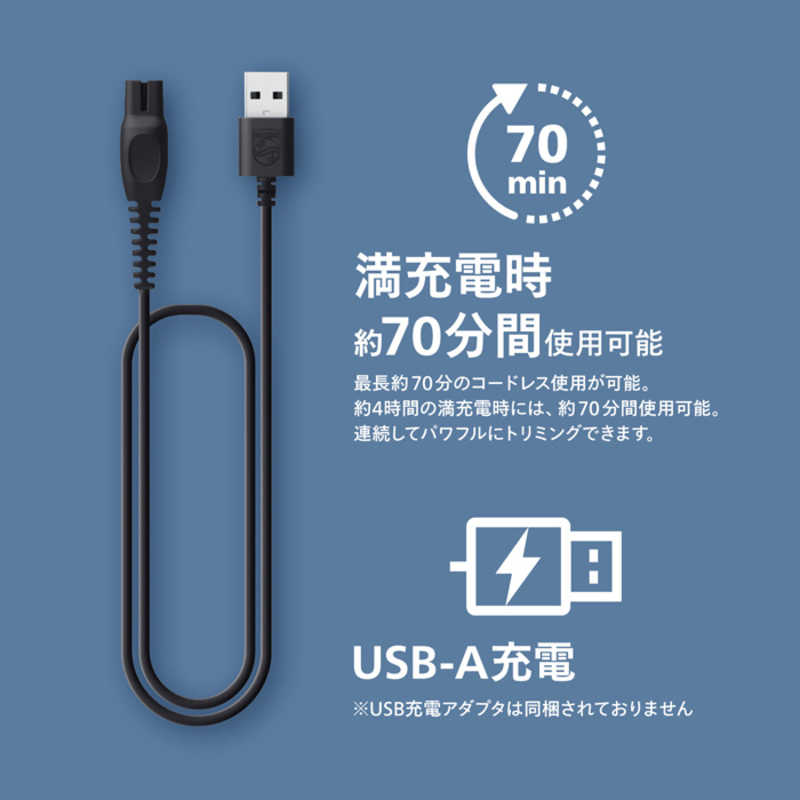 ●同梱物:本体 +トリマー、 取扱説明書、 充電ケーブル、 コーム(0.5~10 mm)、 コーム(10.5~20 mm)、 クリーニングブラシ、※USB 充電アダプタは同梱されておりません