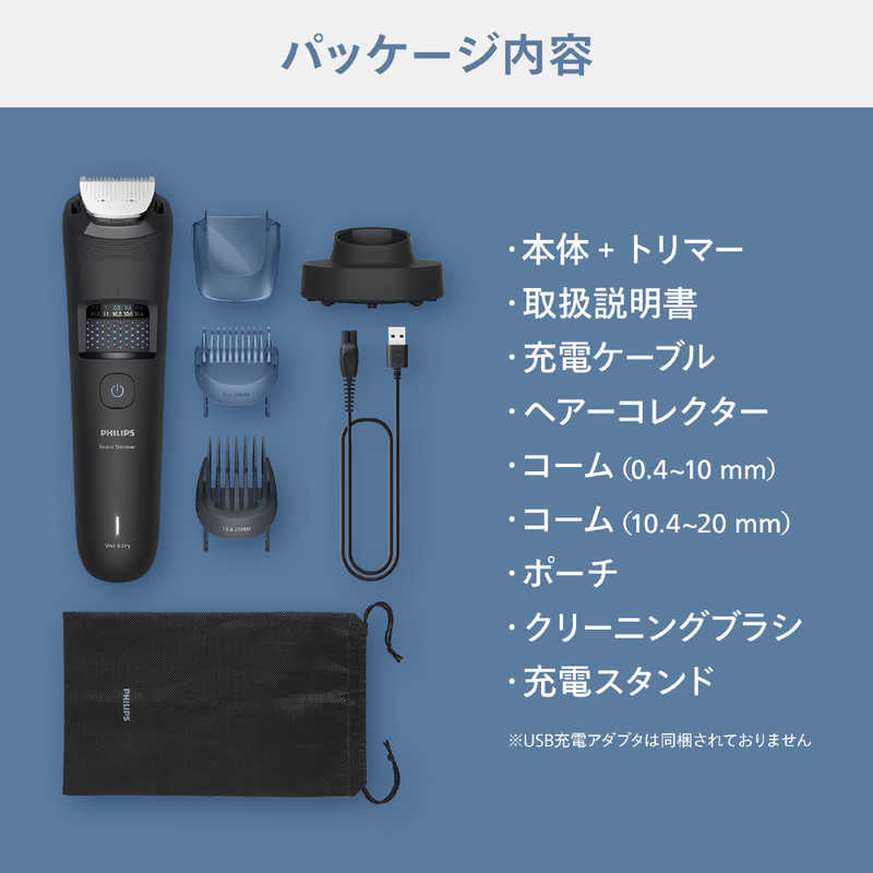 ●同梱物:本体 +トリマー、 取扱説明書、 充電ケーブル、 ヘアーコレクター、 コーム(0.4 mm ~ 10 mm)、 コーム(10.4 mm ~ 20 mm)、 ポーチ、 クリーニングブラシ、 充電スタンド、※USB 充電アダプタは同梱されておりません