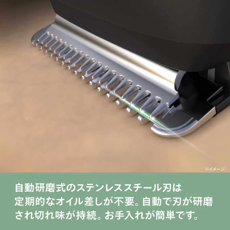●オイル差し不要の自動研磨式ステンレススチール刃 自動研磨式のステンレススチール刃は、定期的なオイル差しが不要。自動で刃が研磨され、切れ味が持続。錆びにくいためお手入れも簡単です。