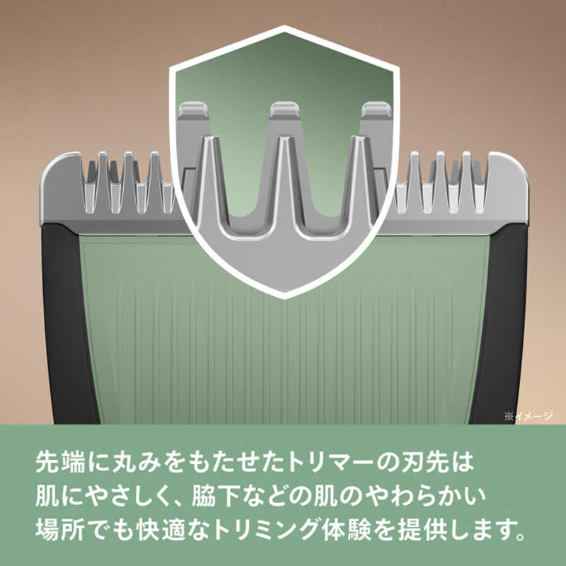●先端に丸みをもたせた刃先で肌にやさしい 先端に丸みをもたせたトリマーの刃先は、肌にやさしく、脇下などの肌のやわらかい場所でも快適なトリミング体験を提供します。