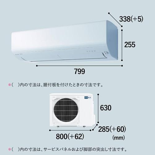 ■サイズ(約):室内機:H255×W799×D338(据付後343)mm *( )内の寸法は、据付板を付けたときの寸法です。/室外機:H630×W800(+62)×D285(+60)mm *( )内の寸法は、サービスパネルおよび脚部の突出し寸法です。