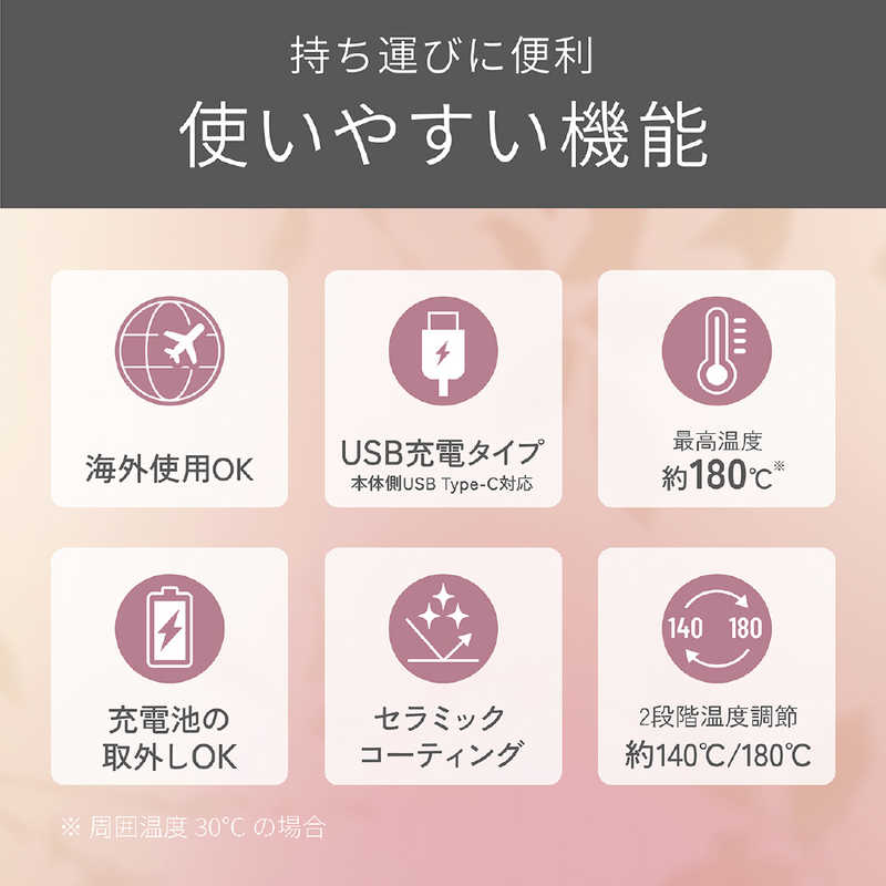●最高温度約180℃で外出先でもしっかりセット!2段階温度調節。
