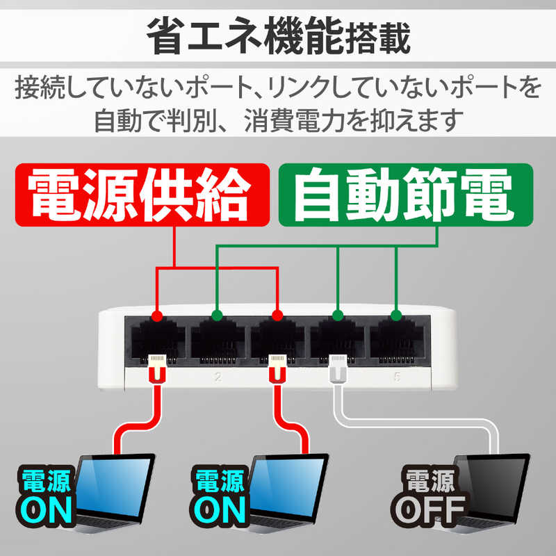 ●らくらく節電機能により接続していないポート、リンクしていないポートを自動的に判別し、電力供給を抑えます。パソコンがシャットダウンしている環境では、大幅な電力の節約を実