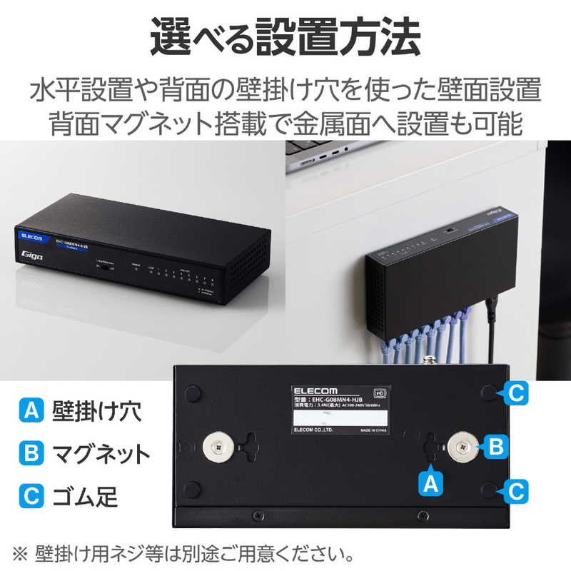 ●本体背面のマグネットを使って金属面へ設置することができます。さらに水平設置や本体背面の壁掛け穴を使った壁面設置が可能です。使用環境に合わせて柔軟に選べます。