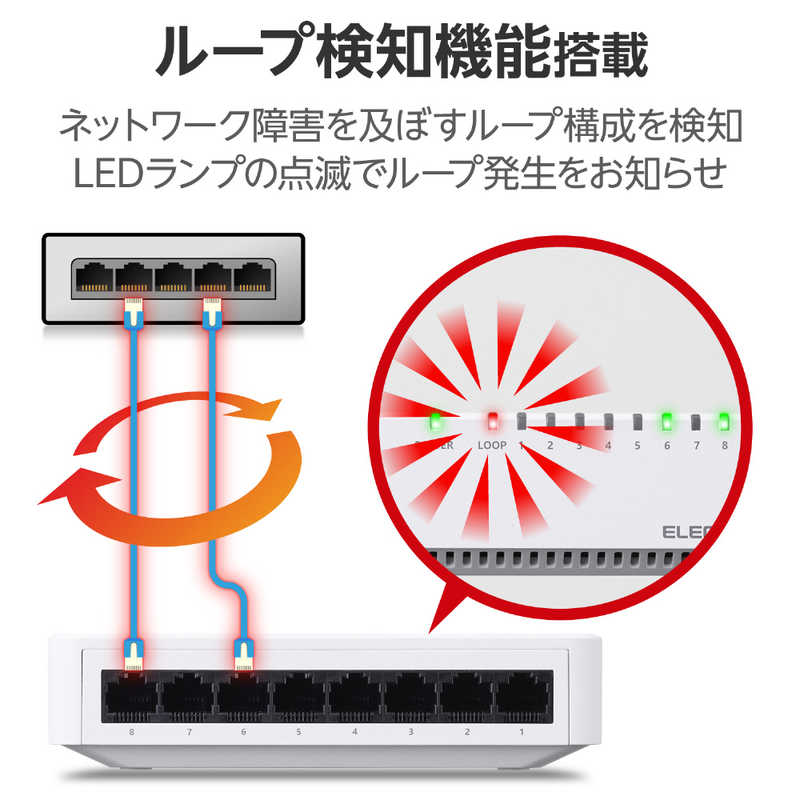 ●ループ検知機能を搭載しています。LEDランプの点滅によりネットワークループ発生をお知らせし、ネットワーク障害の解消を促します。