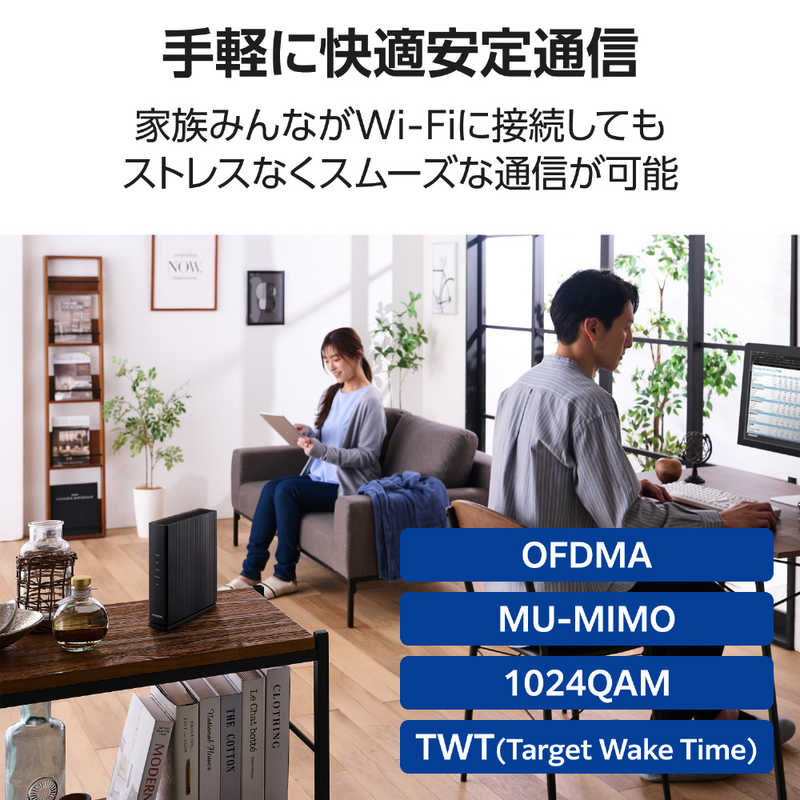 ●複数台接続に強いOFDMA、送信情報量をアップする1024QAM、複数台の同時通信が可能なMU-MIMO(最大2台)、スマートフォンのバッテリーが長持ちするTWTなどにより、快適なWi-Fi環境を実現します。