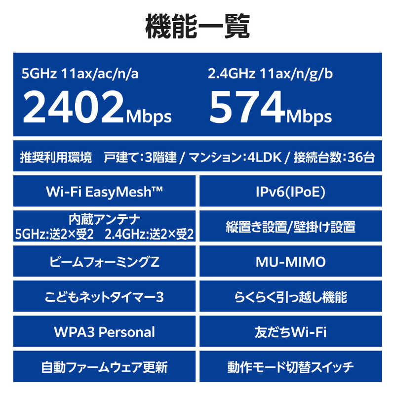 ●無線伝送方式:[5GHz]ac速度/1733Mbps、ax速度/2402Mbps、[2.4GHz]速度/574Mbps、ax速度/574Mbps、g速度/54Mbps、b速度/11Mbps