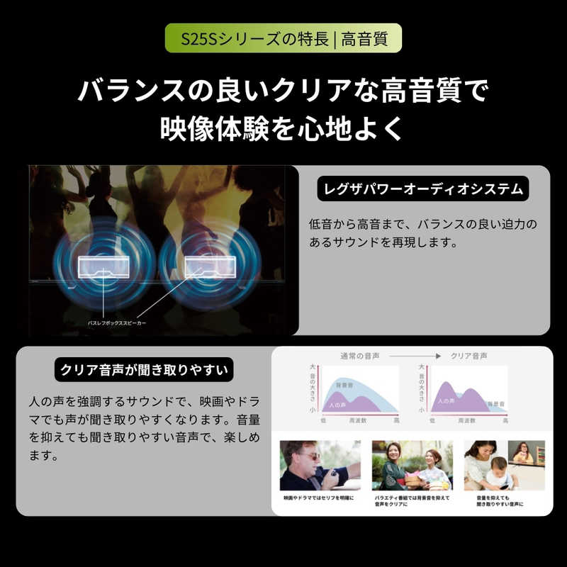 人の声を強調するサウンドで、映画やドラマでも声が聞き取りやすくなります。音量を抑えても聞き取りやすい音声で楽しめます。