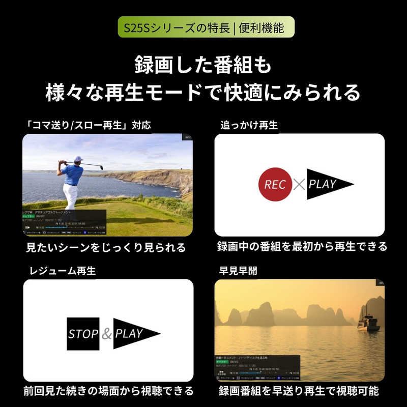 ノイズ抑制に加え、さまざまな高画質処理により、地デジ番組をよりくっきり高画質に。クリアに再現された映像が楽しめます。