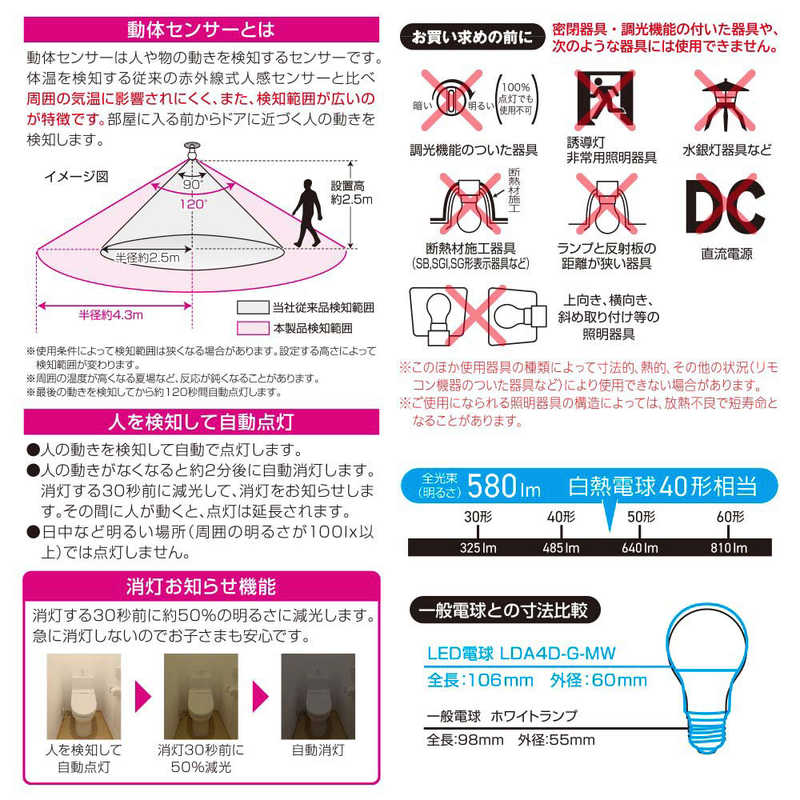 オーム電機 OHM ELECTRIC LED電球 E26 40形相当 昼光色 動体・明暗センサー付き LDA4D-G-MW