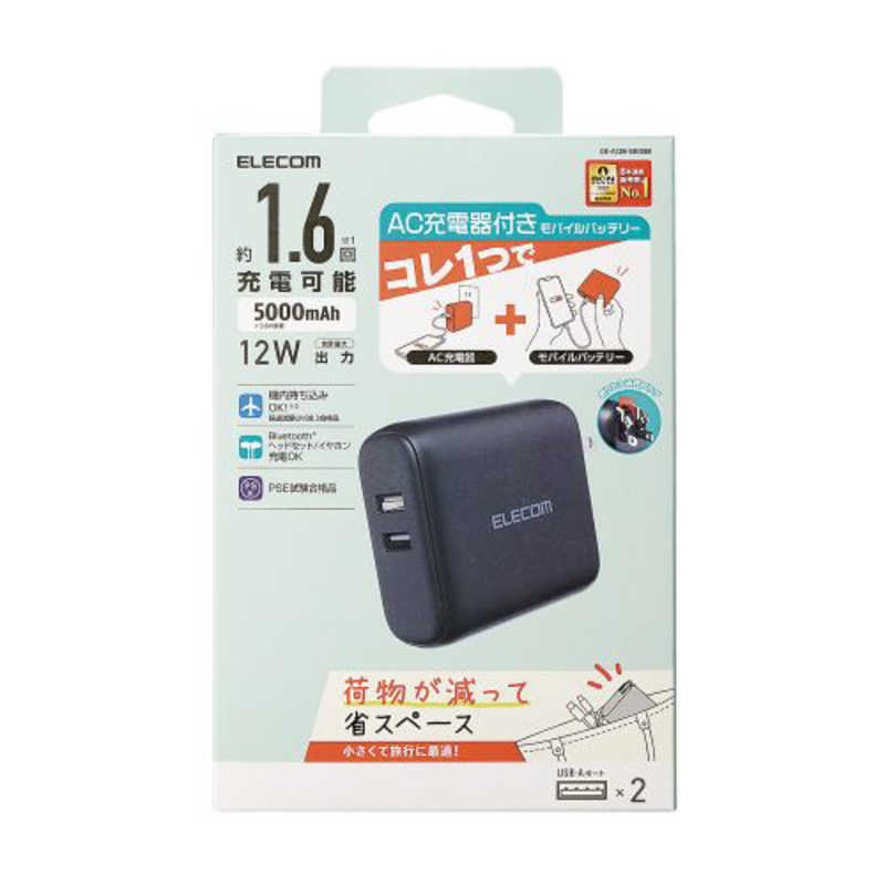 エレコム ELECOM モバイルバッテリー コンセント一体型 5000mAh 12W 出力( USB A ×2) 2台同時充電可 PSE認証 DE-AC06-5000BK
