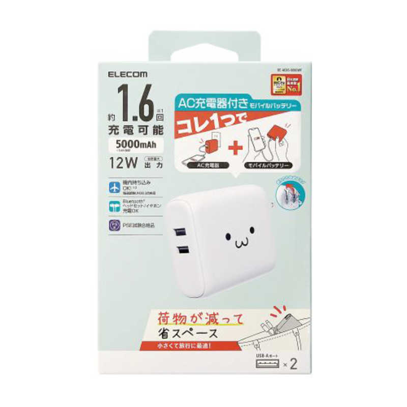エレコム ELECOM モバイルバッテリー コンセント一体型 5000mAh 12W 出力( USB A ×2) 2台同時充電可 PSE認証 DE-AC06-5000WF