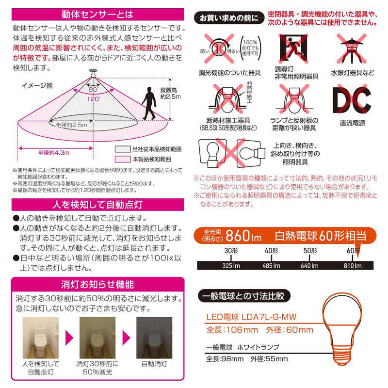 オーム電機 OHM LED電球 E26 60形相当 動体・明暗センサー付 電球色LDA7L-G-MW