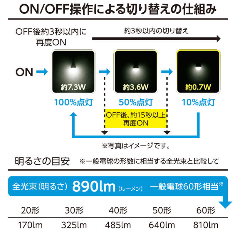 ■ON/OFFスイッチで明るさが切り替えられるLED電球。