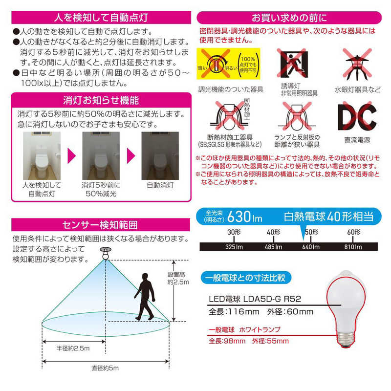 オーム電機 OHM LED電球E2640形相当人感明暗センサー付き昼光色LDA5D-G-R52