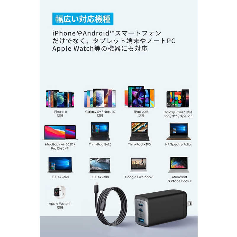 スマートフォン、タブレット、MacBook、USB PD対応のWindowsノートPCなど、多種多様なデバイスを一度に充電可能。PowerIQ 3.0 (Gen 2) を 搭載した2つのUSB-CポートとAnker独自技術PowerIQ搭載のUSB-Aポートを備えています。3ポート利用時の合計最大出力は64Wと高出力。機器毎に異なる充電器を持ち運ぶ必要はありません。