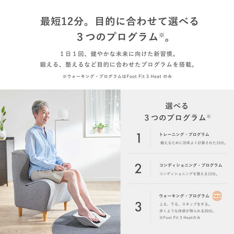 ●筋肉を効率的に鍛える20Hzを採用した1日1回15分の独自のトレーニング・プログラムを搭載。EMSが足裏、前すね、ふくらはぎにアプローチし、歩くときに必要な筋肉を鍛えます。