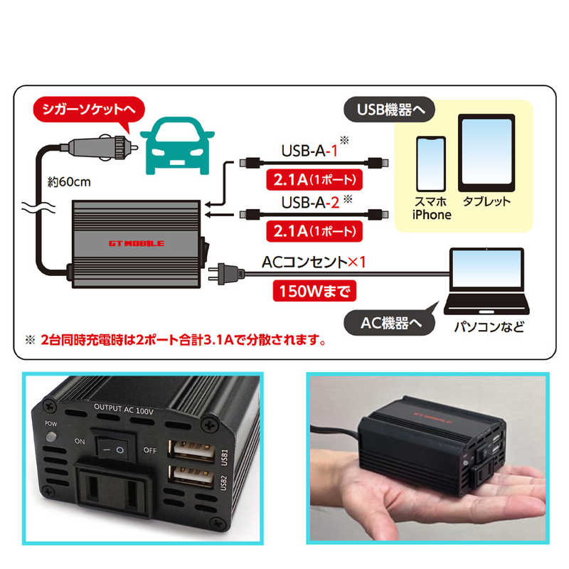 ●ACコンセントの接続とスマホ2台を充電することができます。