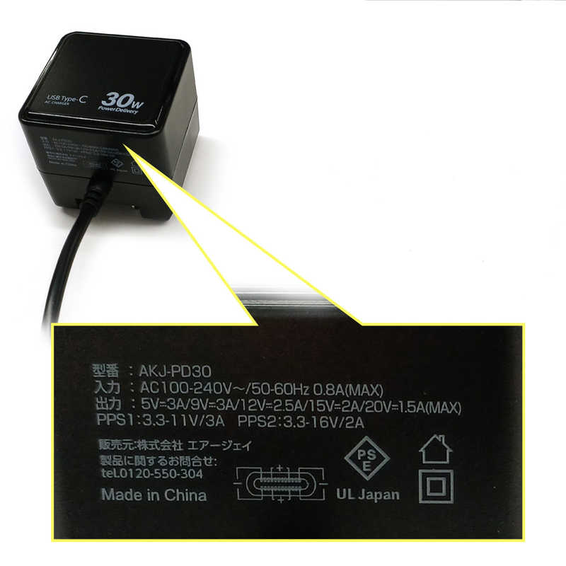 エアージェイ air-j PD30W対応 TYPE-C AC充電器(1.5m) ブラック AKJ-PD30 BK