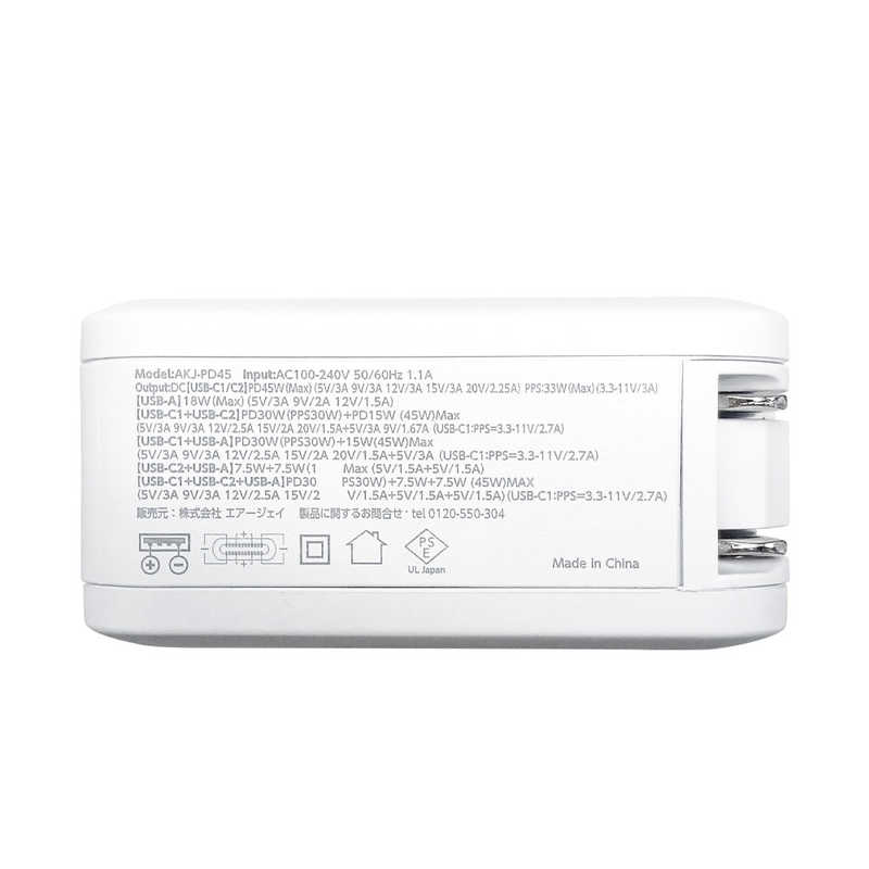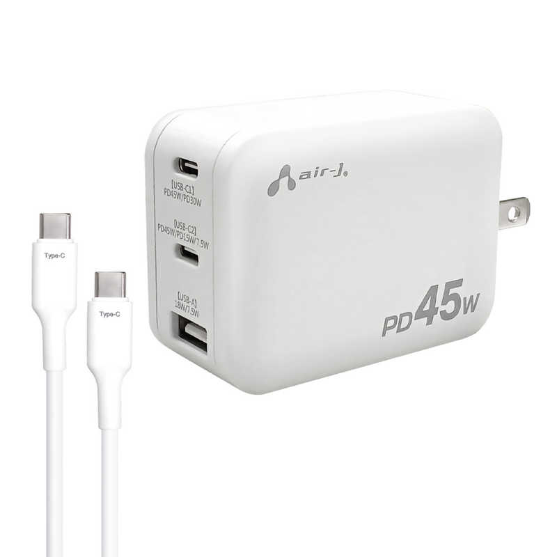 エアージェイ air-j PD45W対応 Type-C2ポート/USB1ポート 急速パワフル充電器+C TO Cケーブル ホワイト AKJ-PD45DX WH