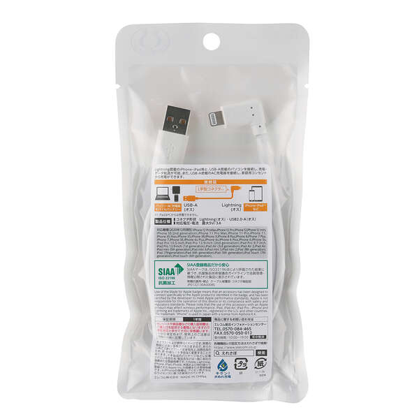 ●使用目的・用途:USB-A端子を持つパソコン及び充電器とLightningコネクターを搭載したiPhone、iPad、iPodを接続し、充電・データ転送が可能です。※iPadはパソコンからは充電出来ません。