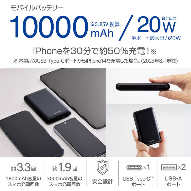 エレコム ELECOM 薄型コンパクトモバイルバッテリー(10000mAh/20W/C×1+A×2) ブラック DE-C44-10000BK