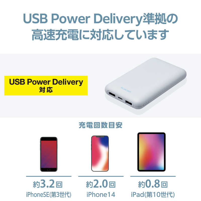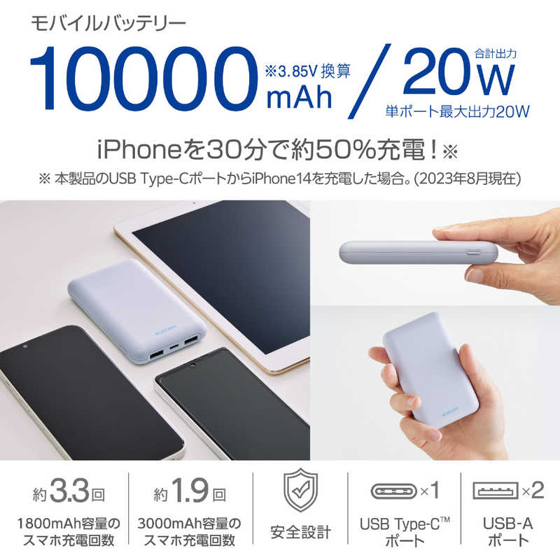 エレコム ELECOM 薄型コンパクトモバイルバッテリー(10000mAh/20W/C×1+A×2) ブルー DE-C44-10000BU