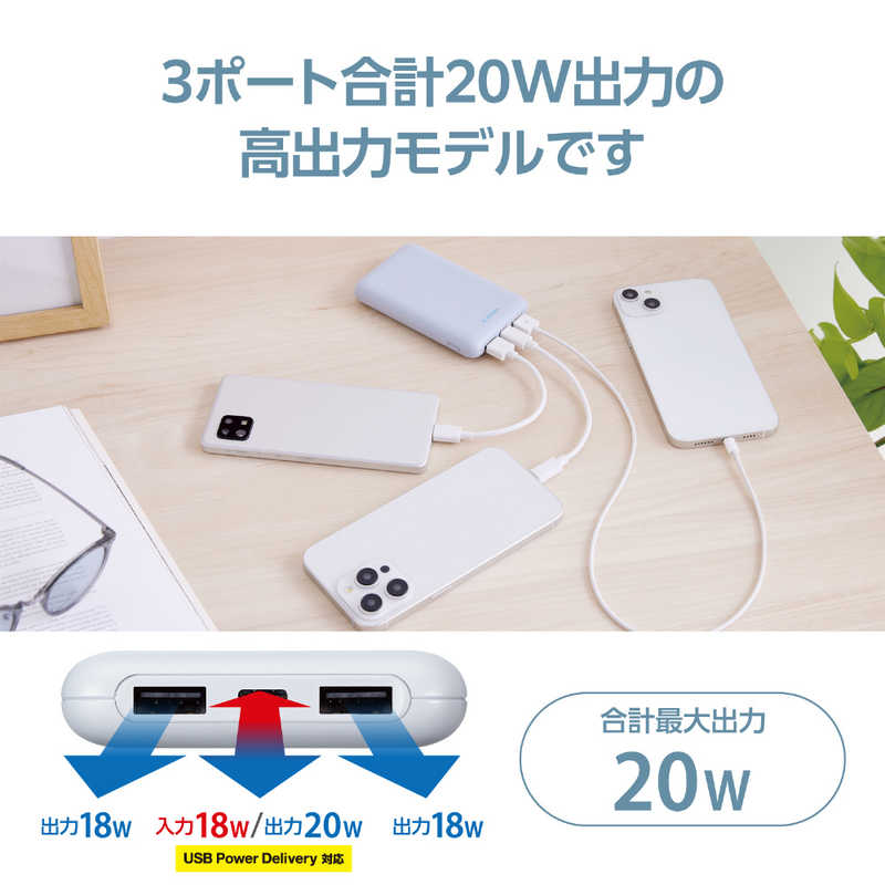 ●USB-Aポートを2ポート、USB Type-C(USB-C)ポートを1ポート搭載しており、3ポート合計20Wの出力が可能な高出力モデルです。