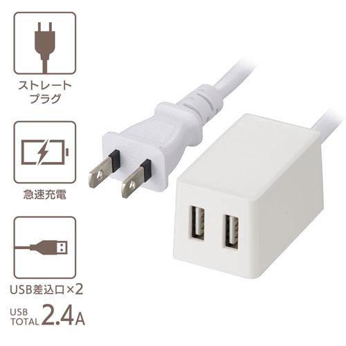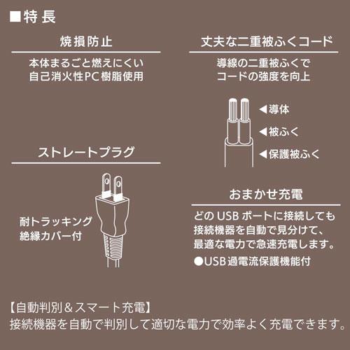 ( 特 長 )● USB充電ポート×2ポート搭載、合計出力2.4A● 急速充電対応● 接続機器を自動で判別して適切な電力で効率よく充電● USB過電流保護機能付き● 本体まるごと燃えにくい自己消火性PC樹脂活用● 導線の二重被ふくでコードの強度を向上● 耐トラッキング絶縁カバー付き● 本体カラーはホワイト( 仕 様 )● 定格入力:AC100V 50/60Hz 28VA● 定格出力:DC5V 合計2.4A● USB:Aタイプ● USBポート:2個口● プラグ形状:ストレートプラグ● コード長:1m● 対応機種:本機はUSB充電に対応したスマートフォン、タブレット、モバイルバッテリーなどに使用できます(ご注意)・USBケーブルは付属しておりません。